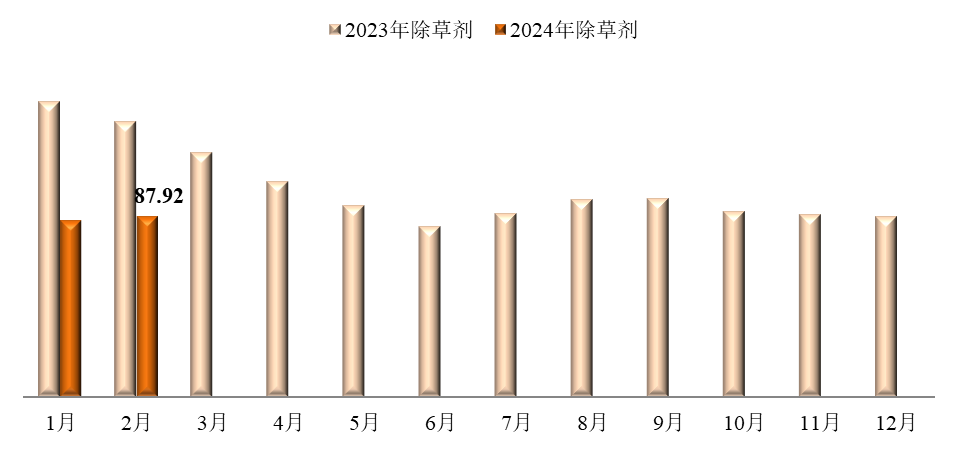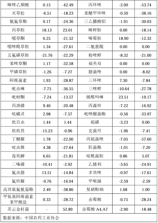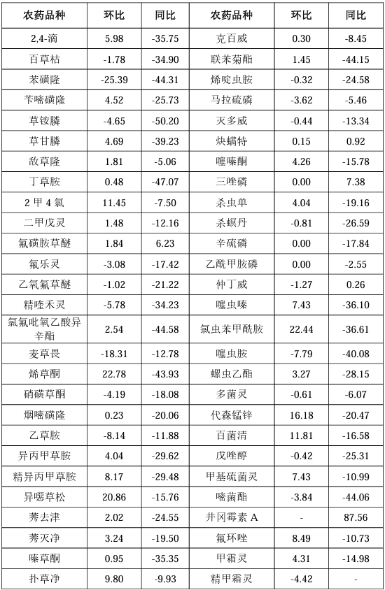 ? ? ? ?除草剂价钱指数为87.92,,,,,,,,环比上涨2.34%,,,,,,,,同比下跌34.91%。。。。。。监测在内的36种除草剂产品中,,,,,,,,加权平均成交价钱环比上涨的24种,,,,,,,,环比下跌的12种;;;;;加权平均成交价钱同比上涨的2种,,,,,,,,同比下跌的34种。。。。。。