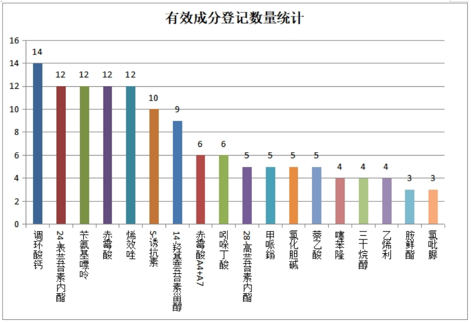 ? ? ? 有用因素挂号数目最多的是调环酸钙14个,,,,,其次为24-表芸苔素内酯、苄氨基嘌呤、赤霉酸和烯效唑,,,,,均为12个,,,,,S-诱抗素等其余29种因素挂号数目在10个以内,,,,,详见下图,,,,,部分因素未列出。。。。。。。。